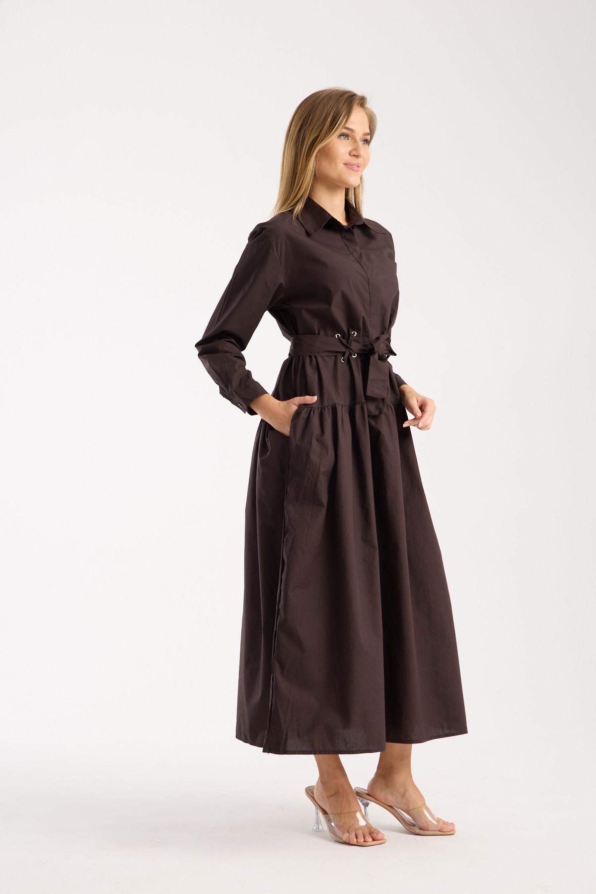 Bağcıklı detayı ile vücut hatlarını ön plana çıkaran bu elbise, bel kısmındaki bağcık ile kişisel stilinize göre şekillendirebileceğiniz bir kesime sahiptir. Kahverengi tonları, doğanın sıcaklığını yansıtırken, her ten rengi ile uyum sağlar. Üst kısmı hafif bol olan bu elbise, alt kısımda hafif bir daralma ile şıklığı artırır.