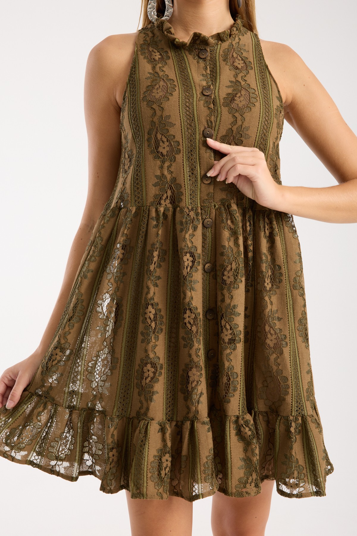 - Dantel Detay: Elbisenin üst kısmında ve etek kısmında kullanılan dantel, şıklığı artırarak feminen bir görünüm sağlar.