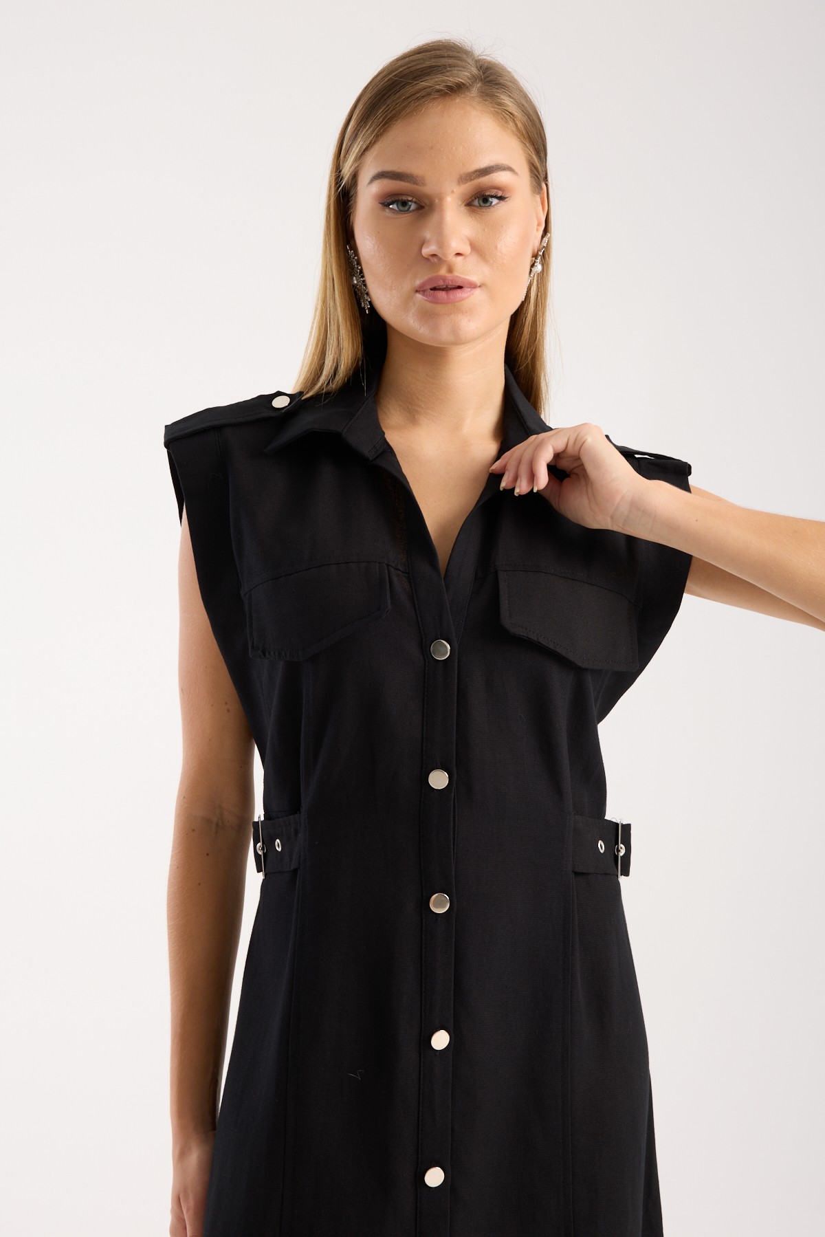 Düğmeli Keten Elbise - Siyah
