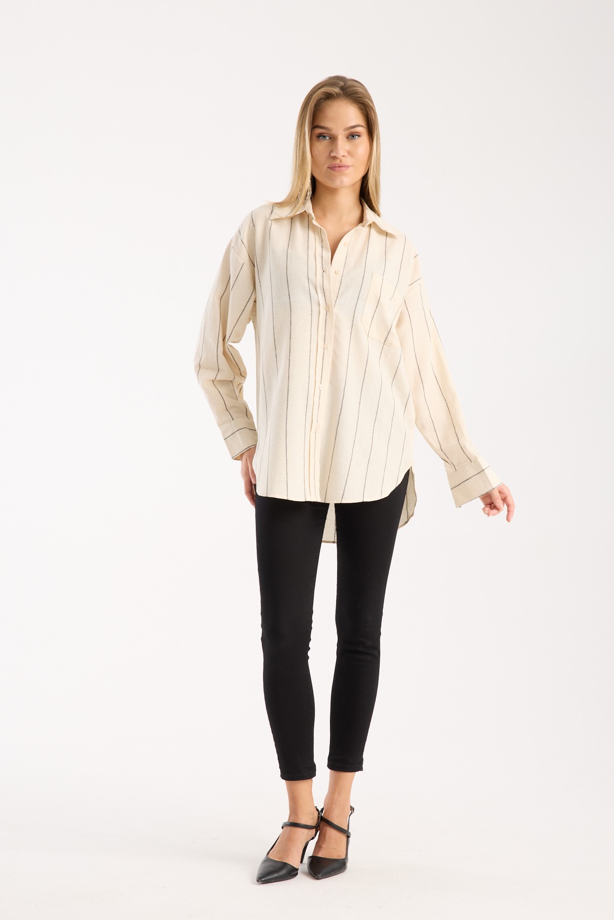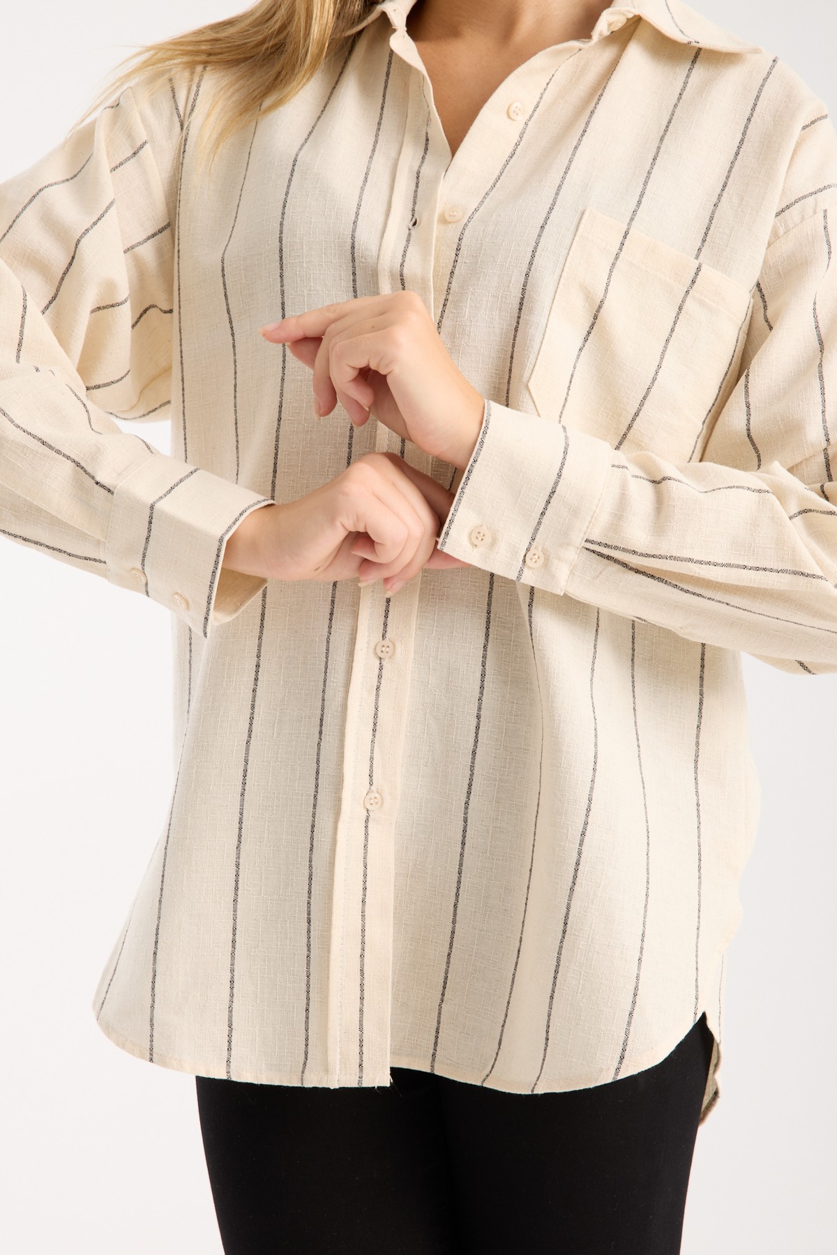 Siyah Çizgili Krem Keten Gömlek