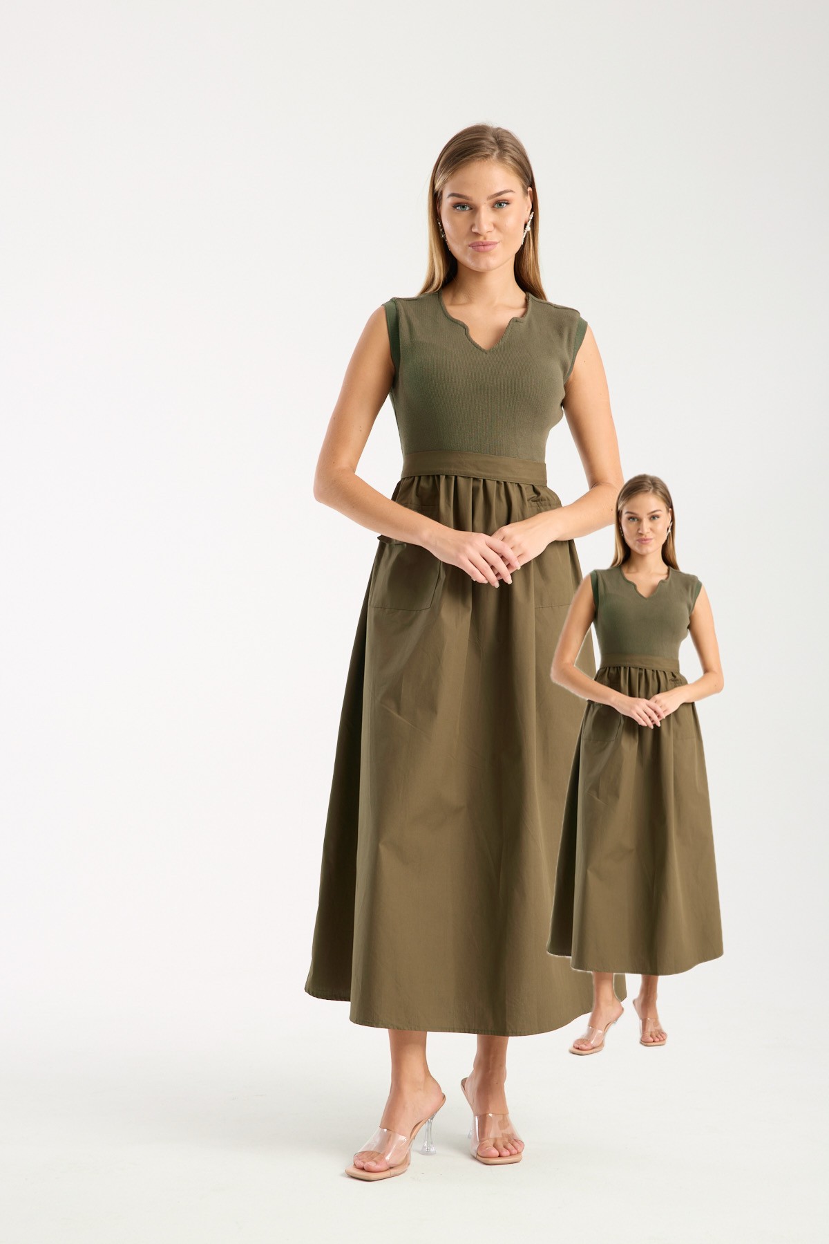 TRİKOLU ELBİSE SU YEŞİLİ